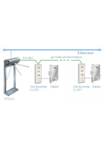 В модели KT02.3 к встроенному в стойку турникета контроллеру можно подключить до 8-ми контроллеров замка PERCo-CL201 со встроенным считывателем, что обеспечивает экономичное оборудование 8-ми помещений системой контроля доступа.